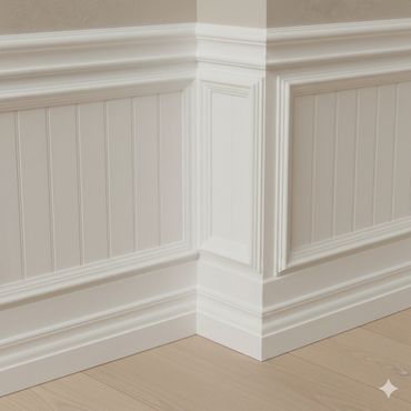 This type of trim is an effective way to frame wainscoting or wall paneling, giving these features more depth and visual impact, making accent walls or half walls feel more intentional and refined. This added detail brings a subtle yet noticeable touch of elegance to the space