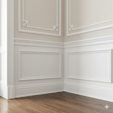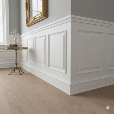 Wainscoting refers to decorative wood paneling applied to the lower portion of interior walls, typically extending one-third to halfway up. It adds depth, character, and durability to a space and is commonly found in areas like dining rooms, hallways, and bathrooms.